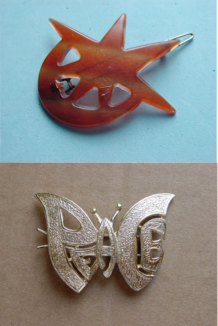 My quest for a flattering hairstyle is always tempered by the fact that I can’t stand having my hair touching my face. This is why I never jumped on the hipster bangs bandwagon. On the plus side, this cursed affliction has given me an appreciation of hair jewellery. We discussed my adoration of Buch + Deichmann ornaments last week, but I have all kinds of hair holders. Here are two more recent accquistions: A celluloid Crescent and star signed “G. Morand Made in France” and a groovy typographic metal butterfly that spells out the word “Peace.”