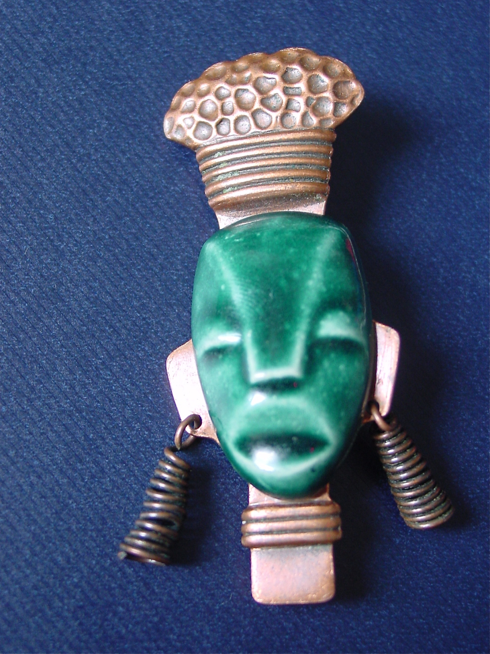 This brooch, while unmarked, is definitely in the same style as Elzac. Due to rationing of materials during World War II, young artists in California started making jewellery out of more unusual materials such as ceramics, lucite and copper. Most of these pieces were unsigned, so I can’t tell you who with absolute certainty who manufactured this piece, but I can tell you that this kind of jewellery had a very short heyday — from 1942 to 1945, to be specific. But the idea using unconventional media and motifs freed up the generation of jewellery designers that followed.