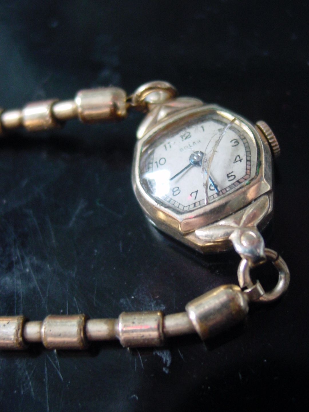 Since we are the subject of ladies cocktail watches, I rediscovered this broken beauty whilst looking for a strap in box of old watch parts on the weekend. Its crystal is cracked from side to side, but it still works. Solar, as long time readers may recall, was the in-house watch brand for the T. Eaton Company. It works well, but I fear I will never find a watchmaker who would be willing to replace the broken crystal. And the crack makes it totally susceptible to moisture and dirt that can rust up the works and discolour the dial.
