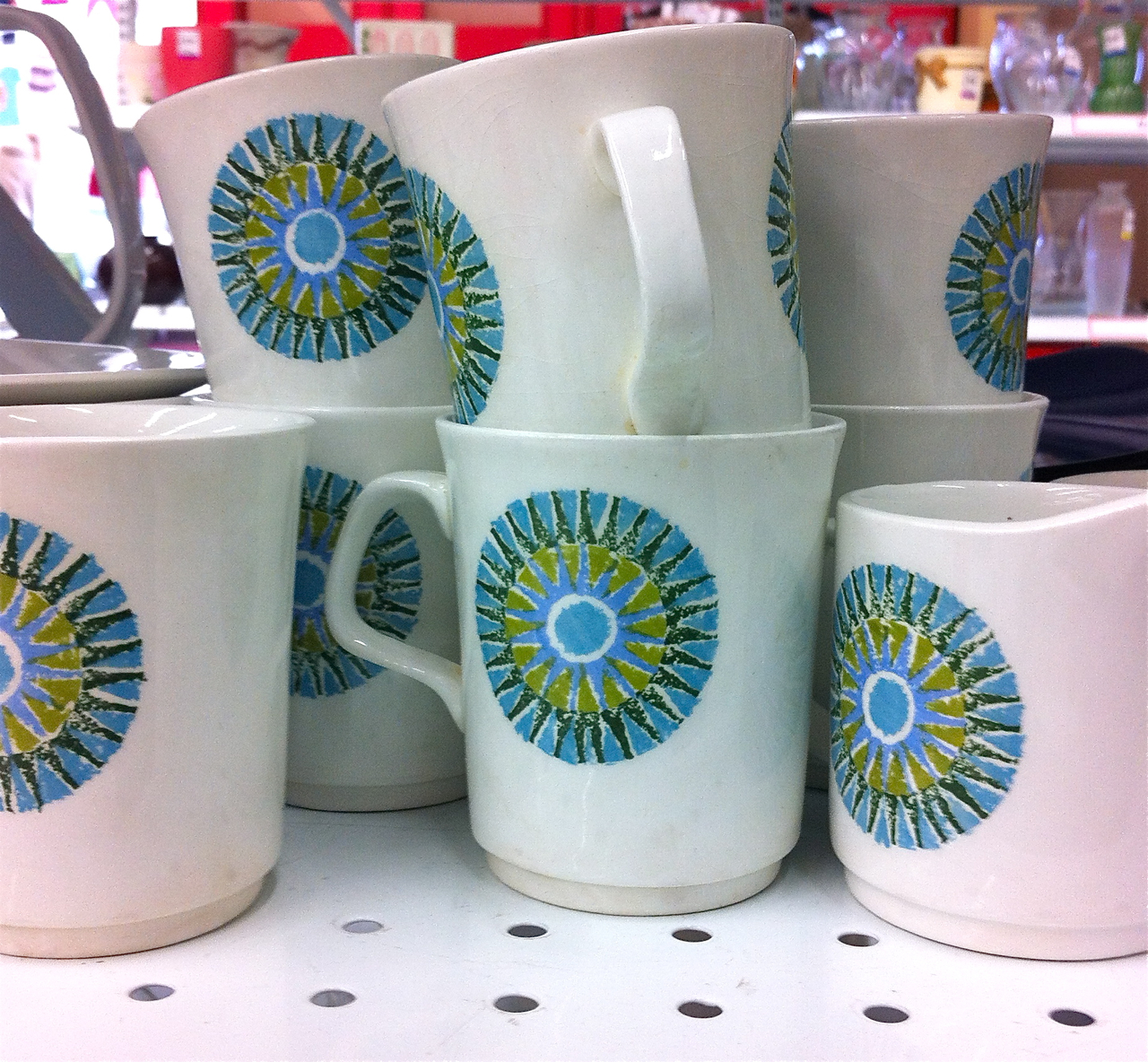 Prowling around the Value Village on a photo safari last week I spotted a complete 1960s Meakin coffee service. It is the Studio range shape decorated with the Aztec pattern designed by Alan Rogers.
