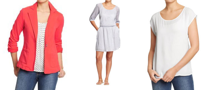 Spring cleaning also means downsizing. I’ve been going through my closet and getting rid of everything that doesn’t fit. Which means that I don’t have a lot of clothes left for spring. So I bought these three pieces on sale at Old Navy. Left to right, I got this coral knit blazer for $15, the striped gauze dress for $25 and a white short-sleeved shirt similar to the one pictured here for $6. Now I just need some sensible walking around shoes and I’m all set for spring/summer.
