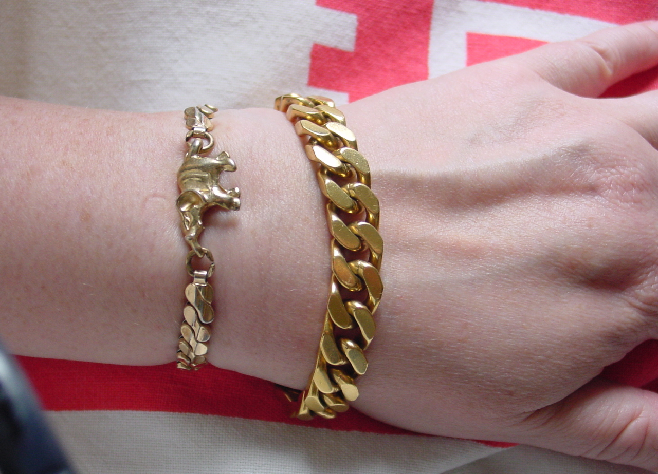 I love all things elephant. Which is probably why I hung onto this little brass pachyderm for so long. It was probably part of a link necklace than came apart. I was going to make a necklace of it and then I remembered that I have like one million expandable watch bands. Instead of attaching them to a watch, I could link it up to this elephant! So I gave it a go. I may try it with a different watch band, but the concept works. I shall look for more little baubles that I can use to repurpose this old bands.