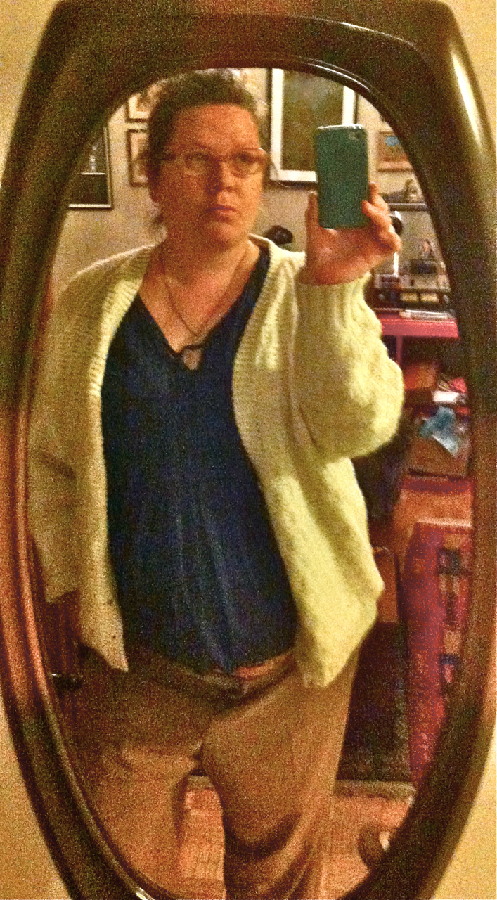 Here they are paired with a tunic from Old Navy and a thrifted wool cardigan. I would say the total cost of this ensemble was about $30, and the most expensive thing was the $10 leather and apple green elastic belt.