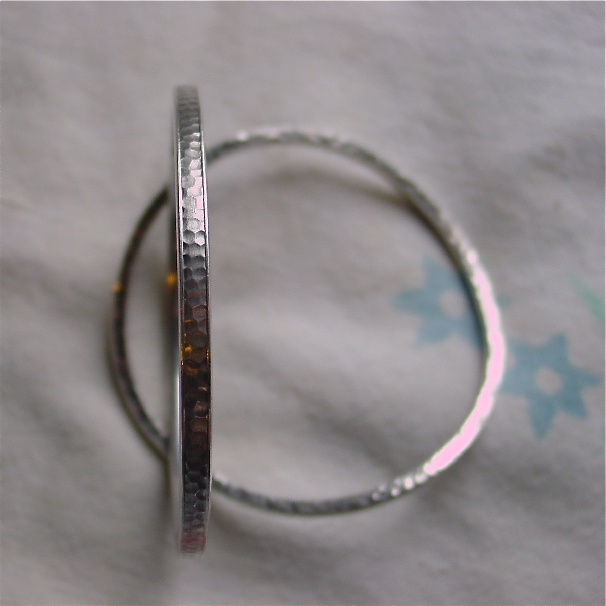 Two more fab things from my good friend Becky. Her grandmother was, by all accounts, a great treasure hunter herself and Becky has inherited all kinds of thrift shop and yard sale finds. These two bangles were made at opposite ends of the 20th century but they share a similar, textured finish. Judging by the construction and markings of the oval-shaped bracelet, it hails from the tail end of the Arts and Crafts era. The wavy bangle feels more like a 1960s or ’70s piece. It is signed WJ, but I haven’t found a similar mark in my research.