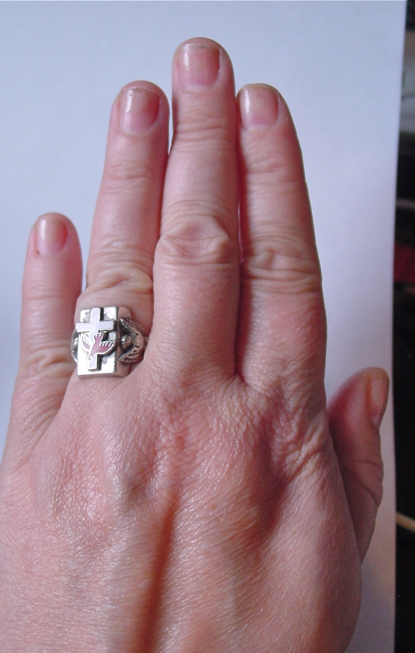 Most of the rings I’m featuring this week are pieces that, for some reason or another, I’ve never shared here before. Today, it’s because it;s a ring I’ve had around for a while, but never wear. Why? I’m not a religious person so I’m generally feel like a hypocrite sporting any religious iconography. But I like birds, and this sterling and enamel ring is festooned with them. There’s a little dove on the front crest which is held up by two eagles. I still wouldn’t wear it, and I’ve tried but failed to sell it. Still, I kind of like having it around.