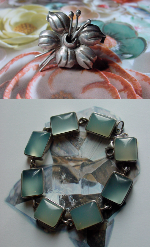 Not only have I been digging through the jewellery box of unfinished projects, I’ve also been culling my collection of art show promos. And then I thought I’d snap some pictures of my pretties on some postcards. Above top is an early Taxco silver hibiscus flower earring that I started converting into a ring (just needs soldering) on a background of Julie Moon‘s ceramic fleurs. Below it is my blue chalcedony bracelet (not a project, I was just wearing it at the time) atop a Carly Waito oil painting.