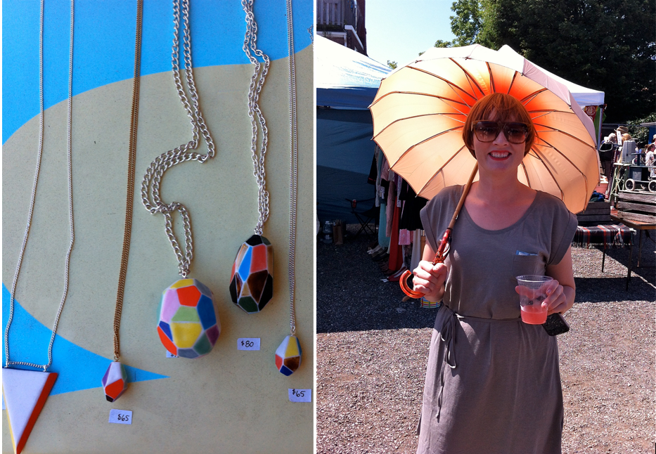 I also wished I could have purchased these gorgeous Julie Moon ceramic jewellery pieces (which piece, you ask: all of them, of course) from Magic Pony. And I am happy that Micah from the Flea bought my peachy parasol. It looks so great with her grey dress (and lemonade).
