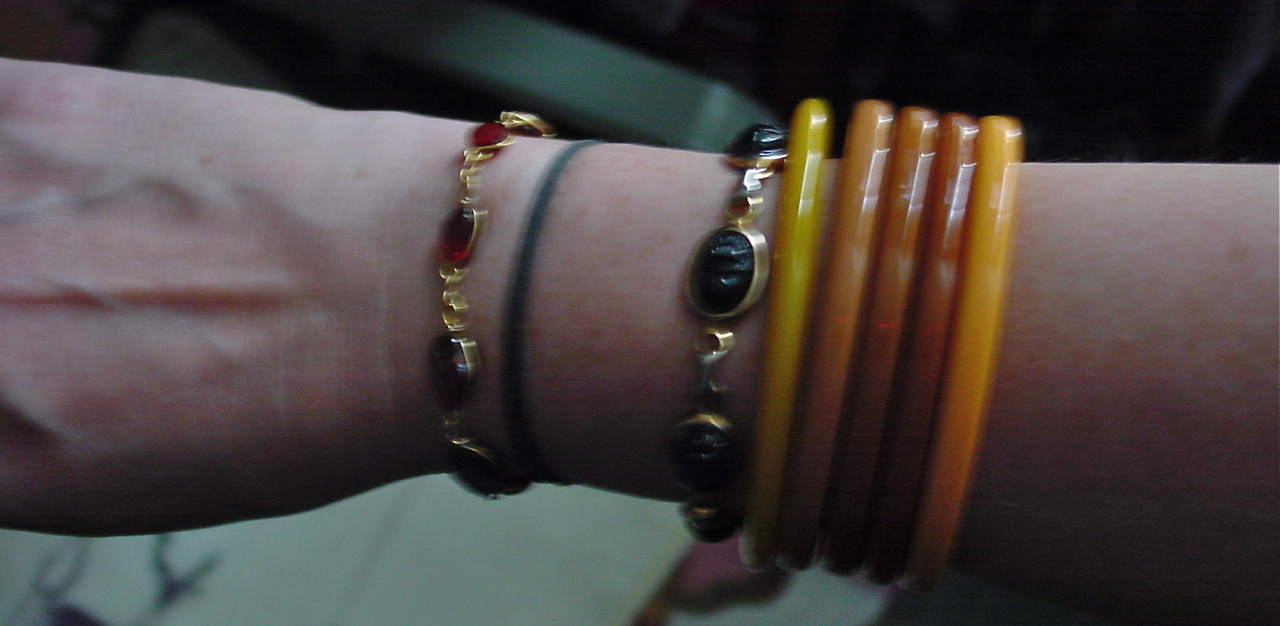 Yesterday, I went to check out the Leslieville Flea and the St. Lawrence Market. I was on a very limited budget but I found an armload of earth-toned bracelets. The amber and black scarab bracelets are $2 discoveries from the St. Lawrence. The mustardy bangles are from a Flea Vendor Lucky Patina (who has an amazing collection of Rafael and Rabajes pieces — you should check his Etsy shop for some eye candy).I love bracelets more in the summer. It doesn’t make sense, but wearing as many bangles as possible just feels right!