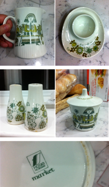 I was at a barbecue and I saw this collection of adorable Figgjo Flint ceramics in the cupboard. Figgjo AS is a Norwegian Porcelain concern that’s still in business today. This pattern, called “MArket” was created around 1963 or 1968 by designer Turi Gramstad Oliver. It used up all of my willpower to resist pocketing these treasures, so I ate too many chips.
