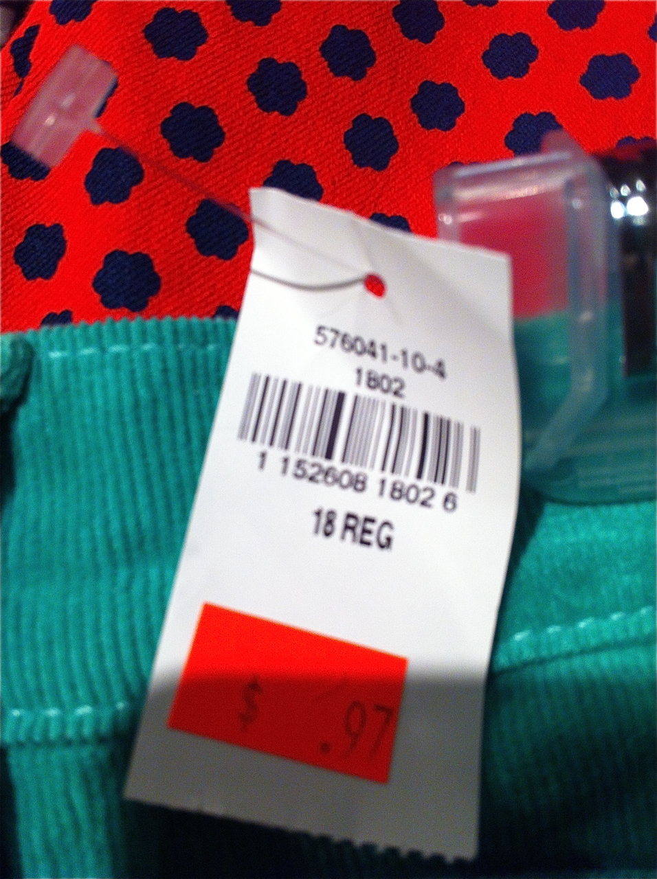 I was away in the country for a week. I had hoped that being physically removed from any opportunity to shop would save me some moolah. But on the way to the bucolic countryside, my sister wanted to stop off at Old Navy. That is where I spent my last $6 on a pair of red and nay print pants ($5) and a pair of mint cords (97 cents). That’s right, I bought a pair of pants for 97 cents.I took a photo of the price tag and everything.