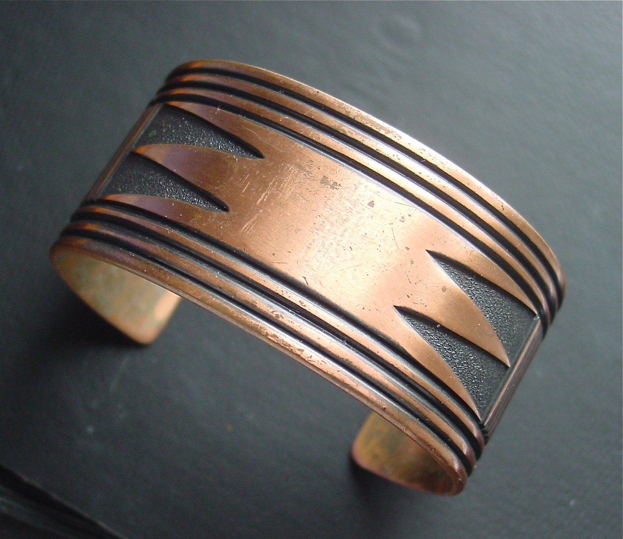 I picked up this copper cuff bracelet for a couple of sheckels on the weekend. It is marked SOLID COPPER in the familiar Bell Trading Post style, although it lacks the actual bell symbols. I’ve had lots of Bell copper pieces — they are easy to find because they were made for the tourist market. But this one is my new, all-time favourite because it’s super stylized reworking of traditional Navajo motifs makes it look very modern. No mean feat since it was made before 1972.