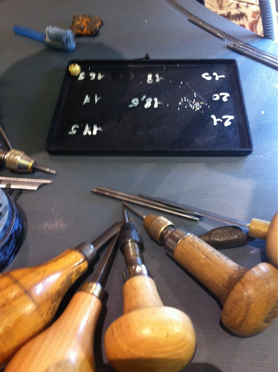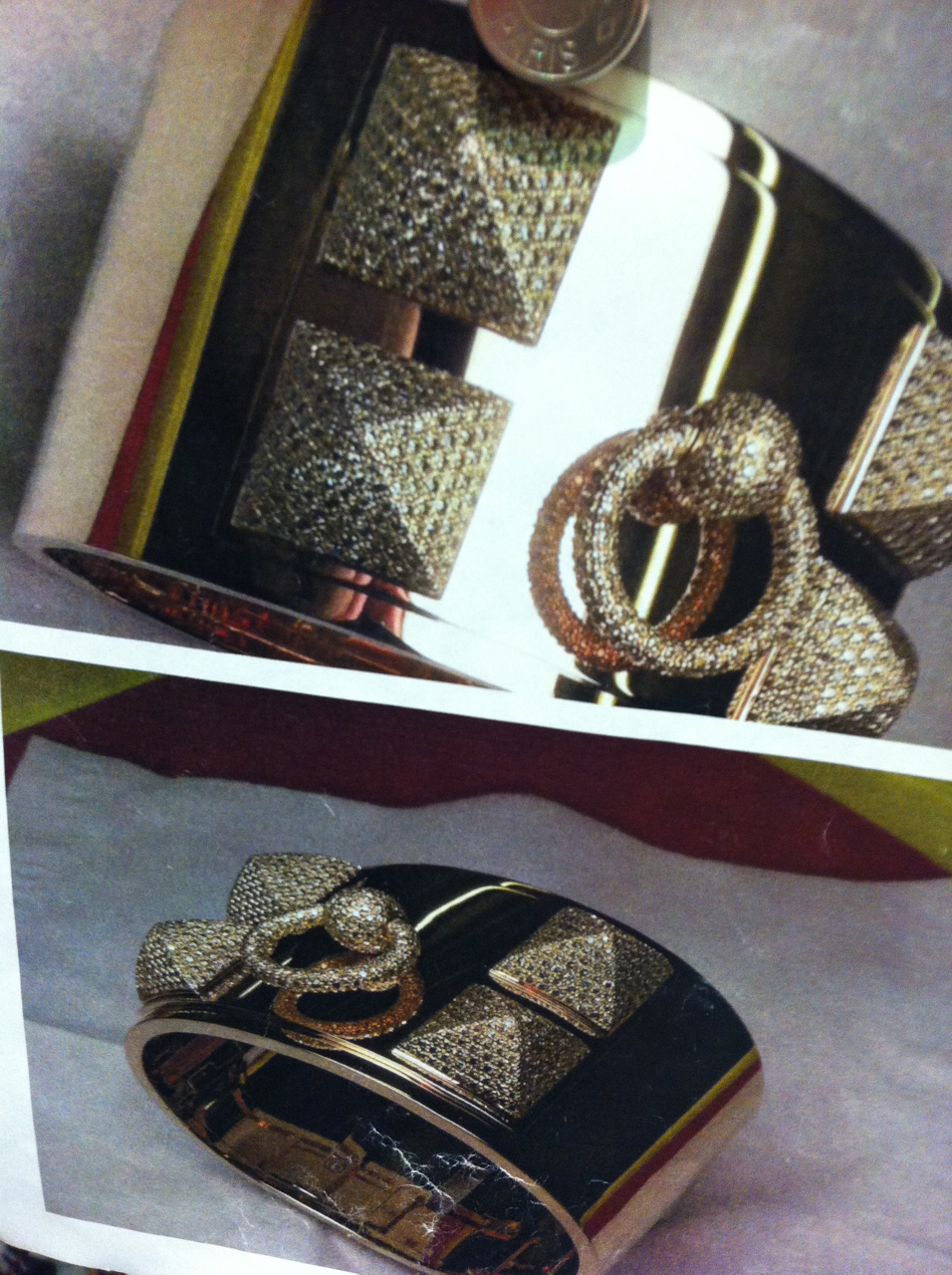 Next, we visited the mini atelier of the gem setter. We watched as he placed and secured a tiny diamond into a pavé setting. “Only 999 more to go,” he said. “It takes about three weeks to finish.” His work would later be attached to a Collier de Chien cuff.