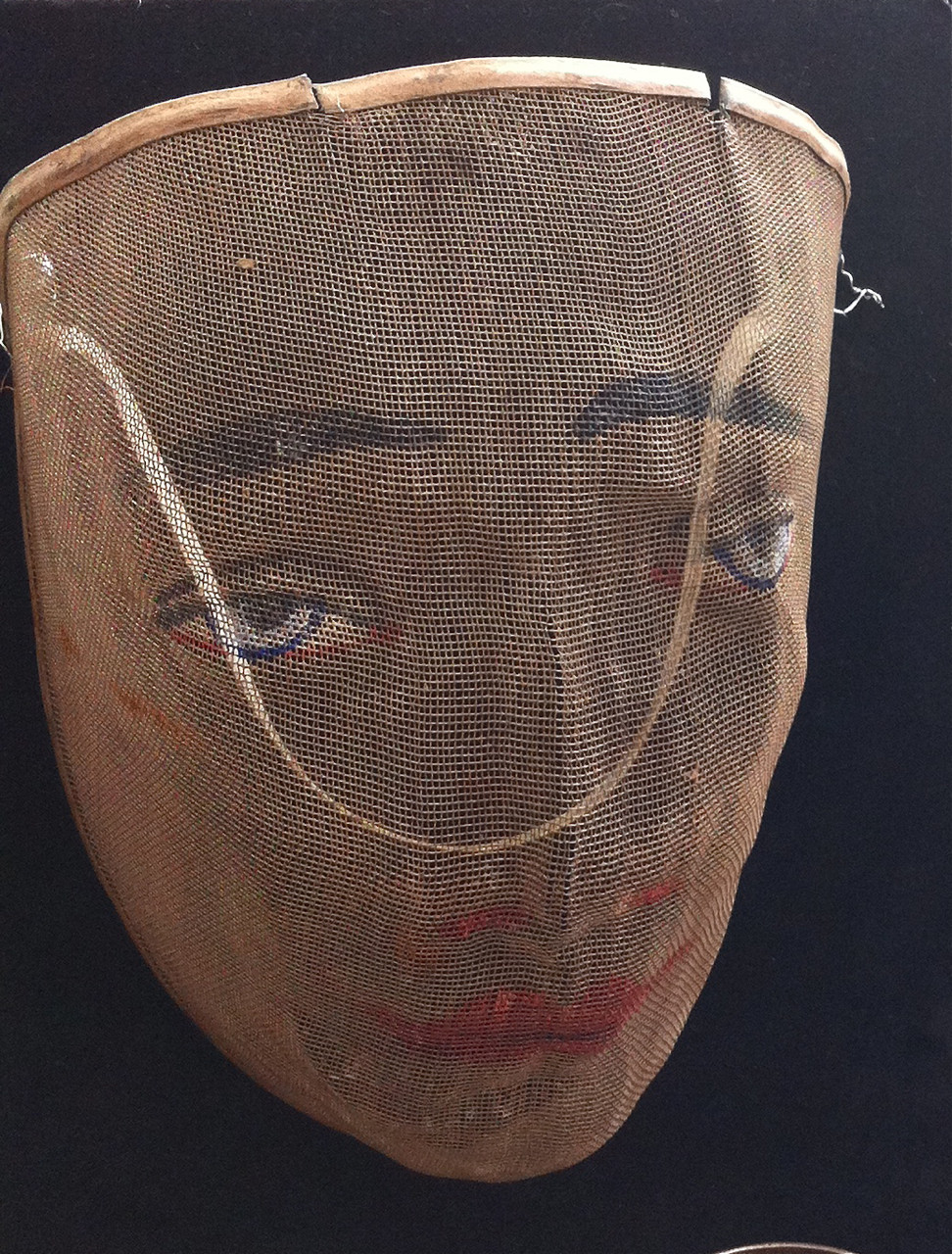 Here’s a creepy antique carnival or Oddfellows ceremonial mask that I snapped at the last Brickworks Flea. I’m thinking that something like this would be really easy to make — just get some fine wire mesh (like screen door netting), shape it to fit over your face, attach it to a frame (you could probably just get a strip of flat aluminium and fold it around the edges), and then paint on some eyes, lips and rough up those cheeks. And voilà! Instant nightmare!