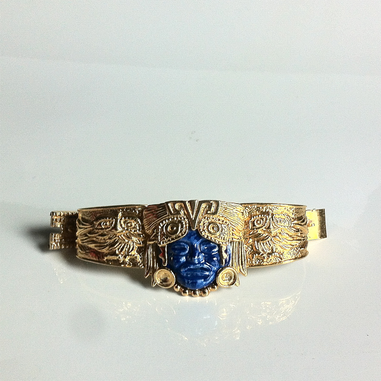 Teran started out in the 1930s working for William Spratling. In 1939, he joined Los Castillo as a designer. In 1952, he started his own shop in Mexico City.He also designed costume jewellery for the Mexican department store chain, Marbel. One of the most popular motifs (at least among the tourists) in this line were gold-plated necklaces, bracelets and earrings set with ceramic Aztec-style faces. Like this bracelet. It’s pretty cool and fairly collectible. The gold plate is peeling on the clasp, but otherwise it’s in excellent shape. It is signed Marbel SG Mexico ST on the back of the centre panel and it still has a store sticker on the back of the ceramic plaque.
