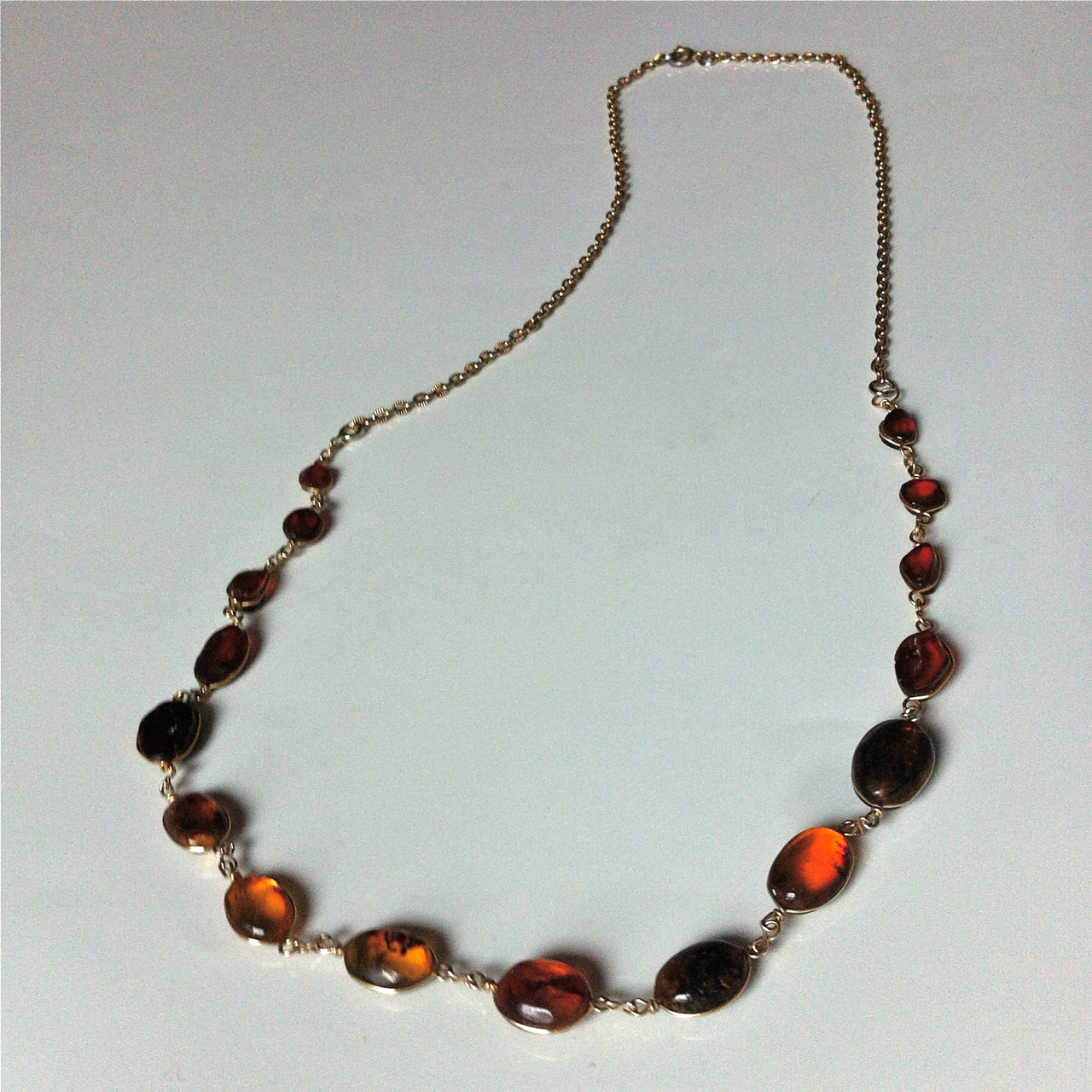 And finally, I combined two wire-wrapped amber bracelets to make this pretty necklace. The bracelets featured two different sizes of stone so I ordered them for a graduated effect (again — I love graduated necklaces). It still wasn’t quite my desired length so I added some chain. I have been wearing it non-stop, I even fell asleep in it. That is when I discovered that the wire the amber pieces are wrapped in is pretty soft, and it came apart in my bed. I put it back together again, but let this be a reminder to all that you shouldn’t sleep in your jewellery.