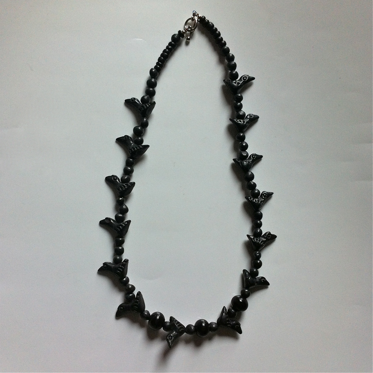 Also from Mexico comes this Barro Negro Bird Fetish necklace.Basically it just needed or be restrung and lengthened, but I couldn’t find ceramic beads to match, so I substituted some larger wood beads in the centre and smaller wooden discs in the back to give it a graduated feel.I also added a new clasp — the previous closure was a dressmaking hook and eye.