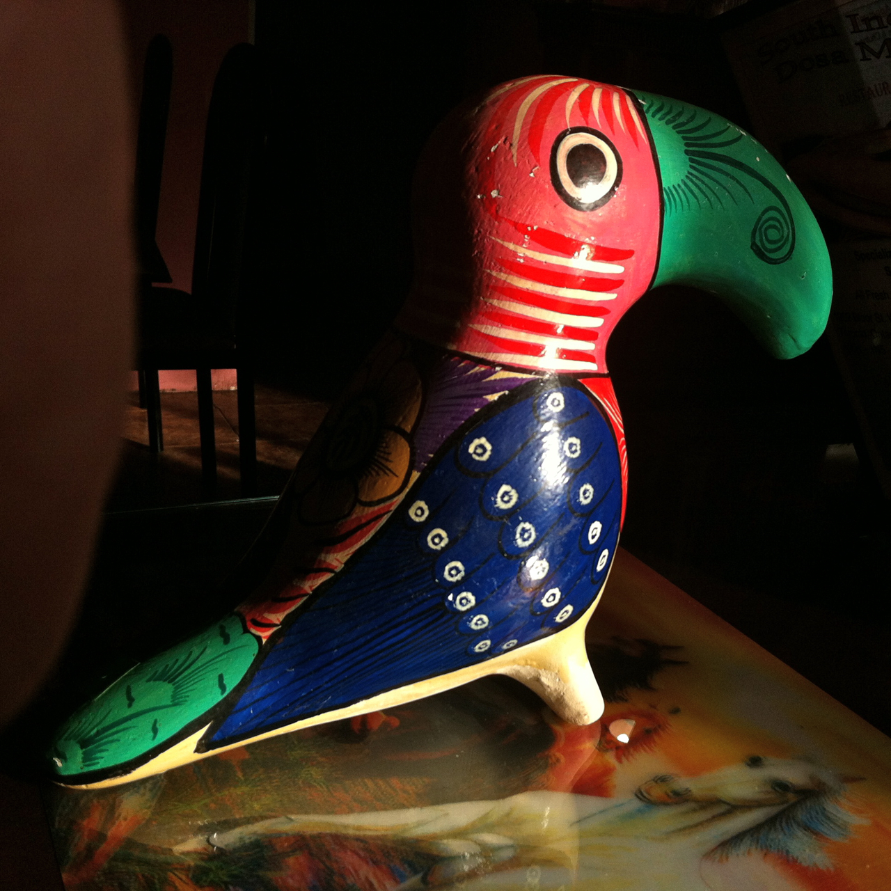 Here’s the latest addition to my Mexican folk pottery menagerie: A ginormous barro pintado or painted clay toucan that I found at the Salvation Army on Saturday for $4. It is signed W.C. 1994 Mexico.