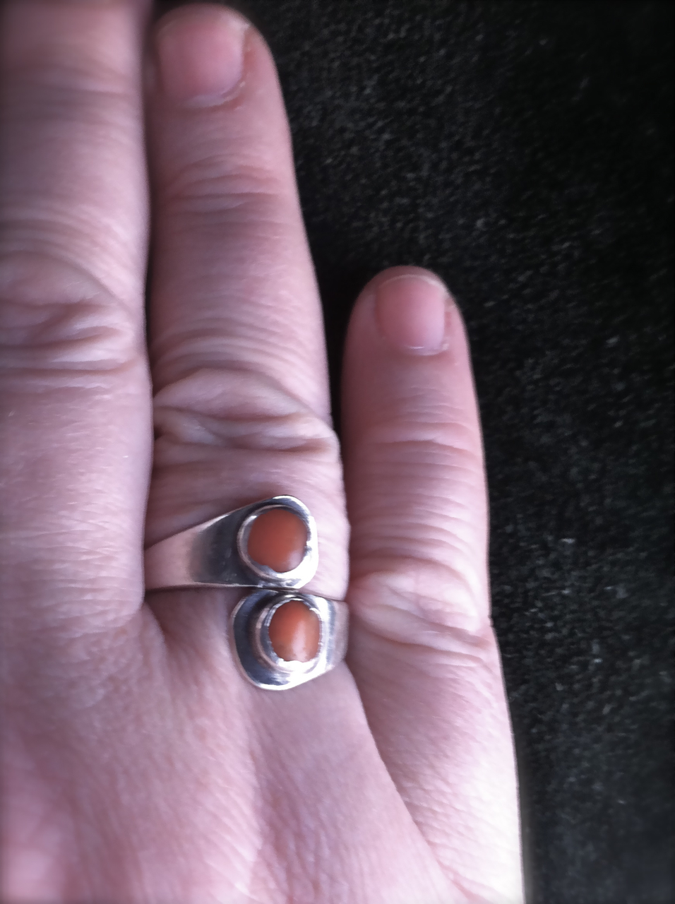 I picked up this silver ring the same day I found my oversized toucan. It is simply marked “SILVER” on the inside and the stones and their settings look kind of rustic. But at the same time, there’s something that suggests that that rustic-ness is deliberate. I just kind of like it is all.