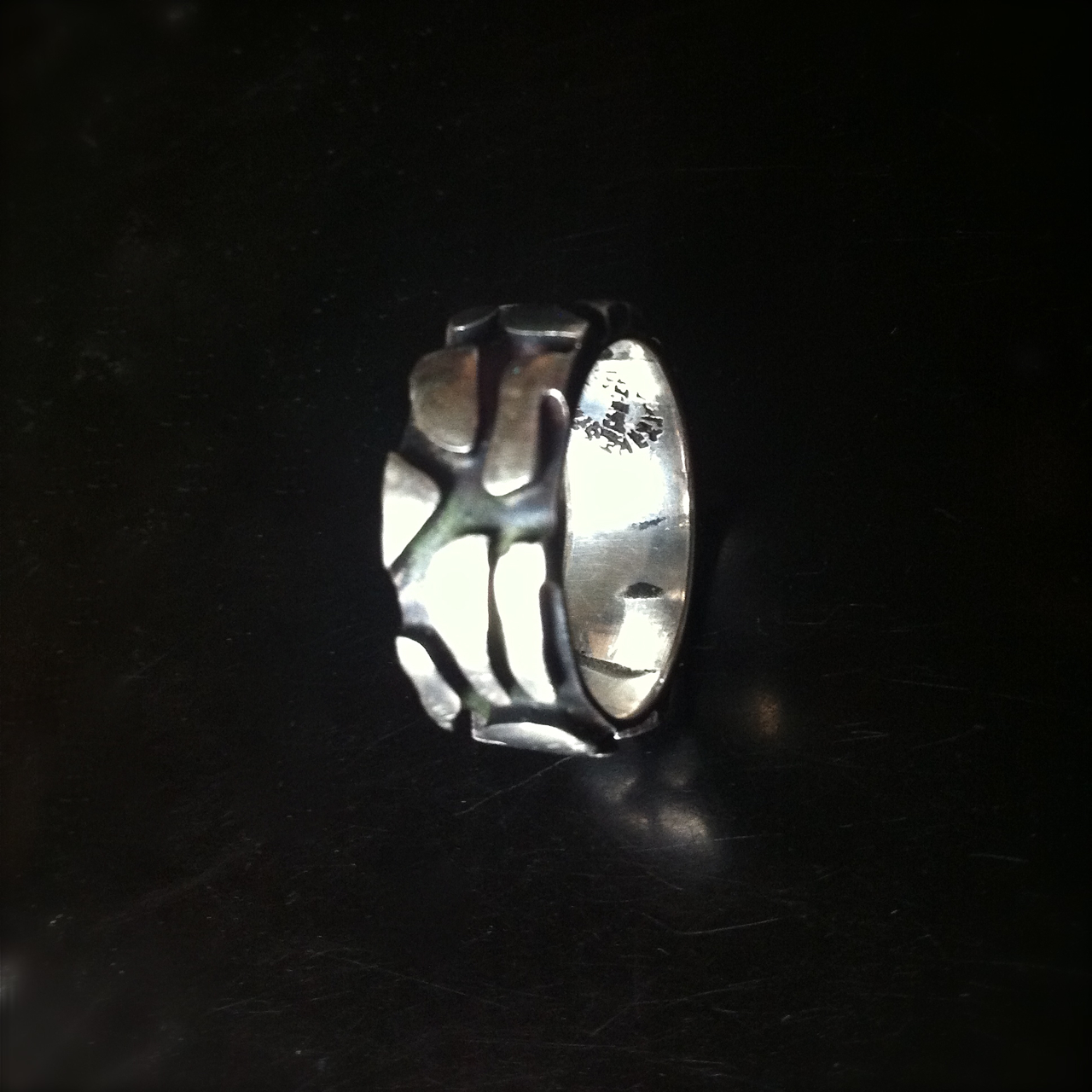 Melendez was a silversmith in Taxco who trained under William Spratling, worked for Los Castillos and Margot de Taxco and, of course, made his own creations. The detail on the ring is quite intricate: the raised parts have been carved away and the valleys have been oxidized to further put the abstract designs into relief. Here’s another picture that (perhaps) better illustrates the beauty of this ring!