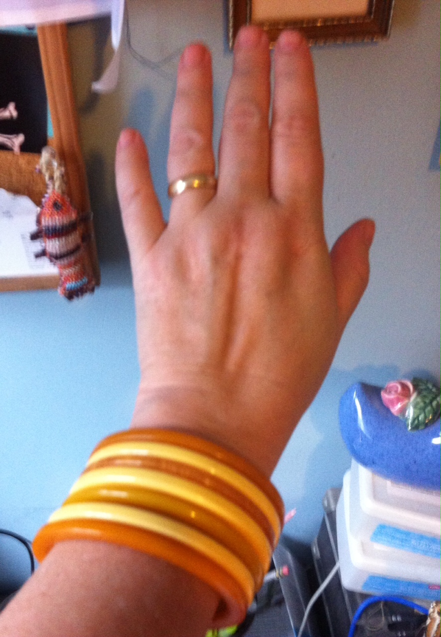 Some new additions to the yellowy Bakelite bangle collection. I found three light yellow spacers (shown here with more mustardy bracelets from my collection) at the Value Village last week. And only 0.99 cents!