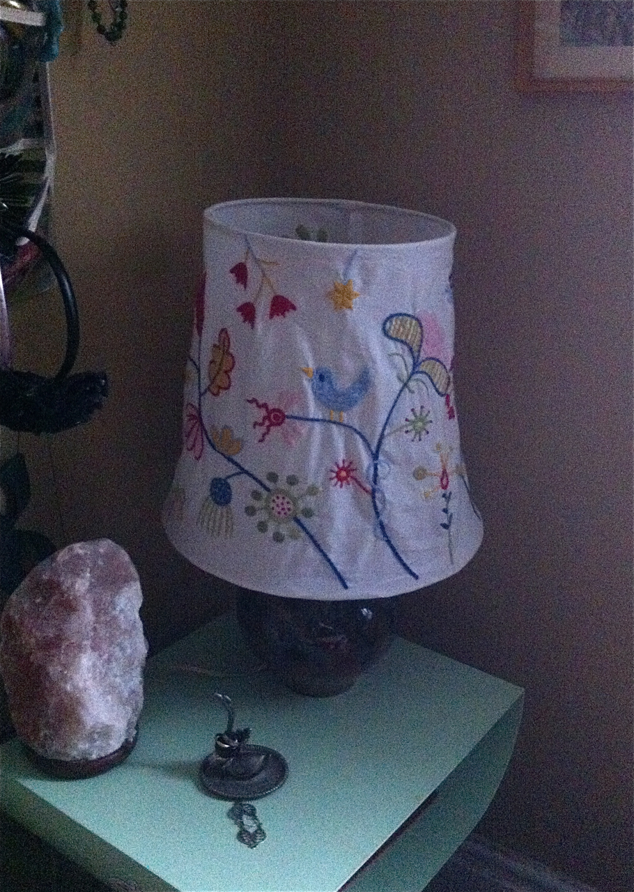 I found this Ikea Alfhild Fagel embroidered lamp shade on the side walk. I’m a sucker for embroidery and had just bin on a pinterest bender pinning examples of Mexican Otomi embroidery to my boards. I used it to replace the too small shade I had on this art pottery base. Know I have a too big shade, but I like it.