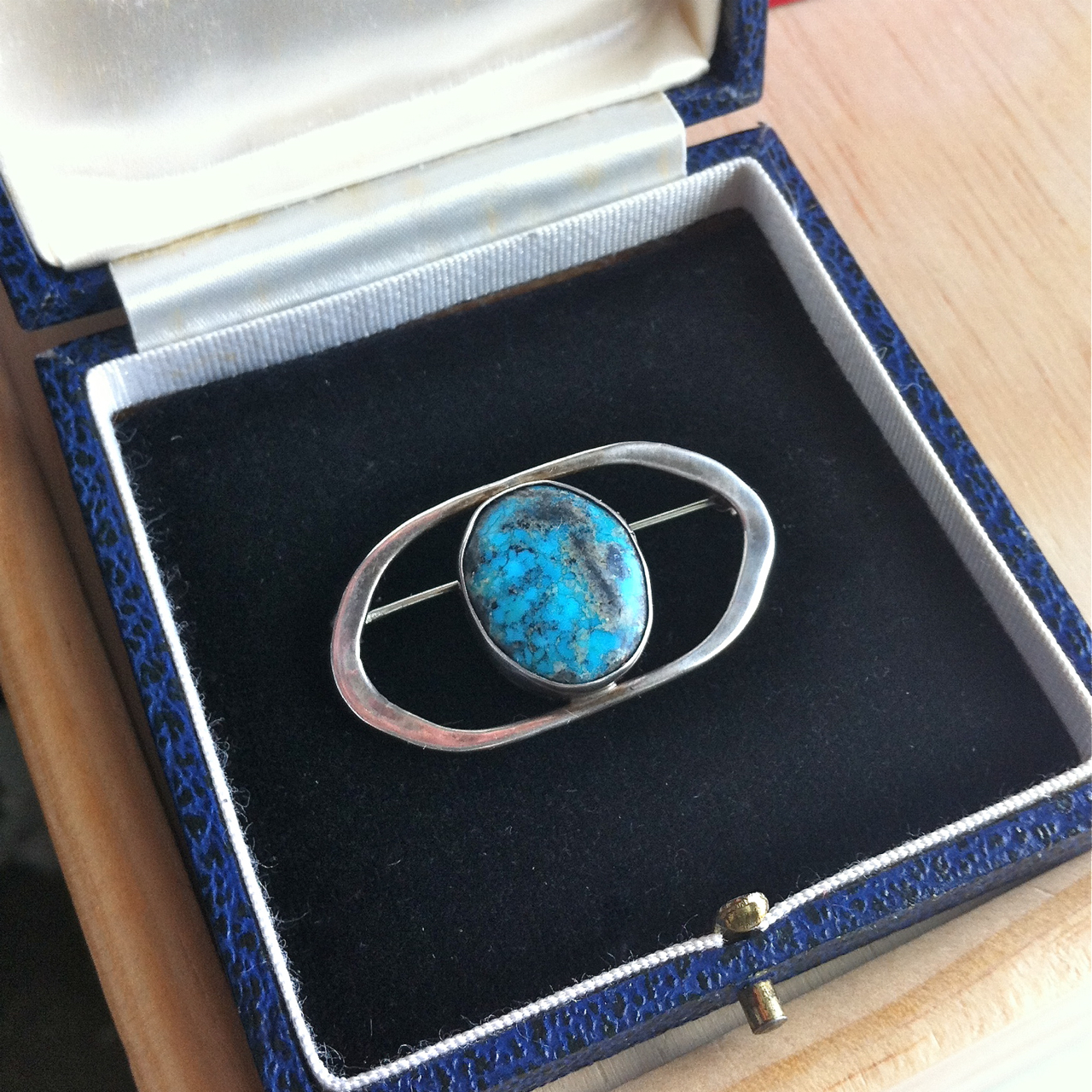 My first thrift shop find of 2014: This silver and turquoise oval pin. The stone is simply gorgeous, so the minimalist setting really frames it well. It is marked, but alas all I can make out are the letters S and T. It looks like a studio piece to me.