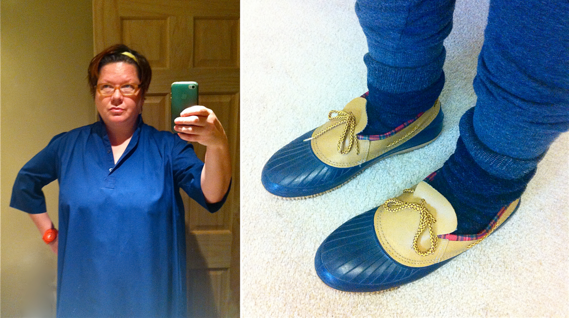And even though I just last week resolved to buy no new clothing, I had not packed properly for the ever changing weather. The duck shoes were a necessity (and only $3). And because it was so cold when I left Toronto, I was dressed like a woolen bullet and needed a garment that I would not melt in. It’s a neat ’80s-era dress by Serbin (it also has a Simpson’s label inside), which made “Miami-style” dresses. I picked it up for $5.