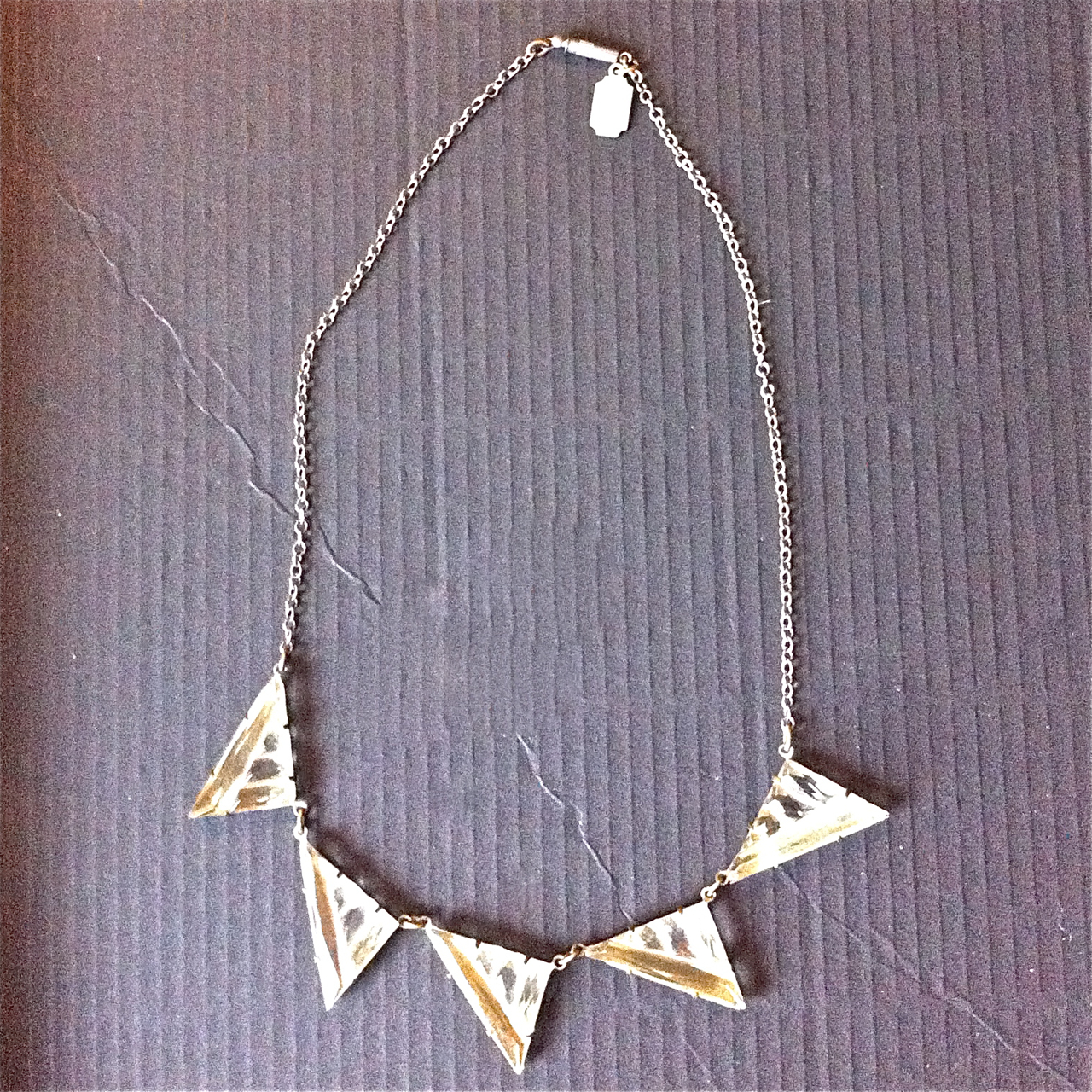 The company was founded by Steve and Elise Pittelman and Elise was the main designer for the company until it closed up shop in 1996. I love this necklace because the triangular shape of the panel pieces is very modern, but when you get up close and examine the citrine-coloured poured glass insets, it’s very art deco, Even the brass findings are etched. Its vintage faux vintage at its best!
