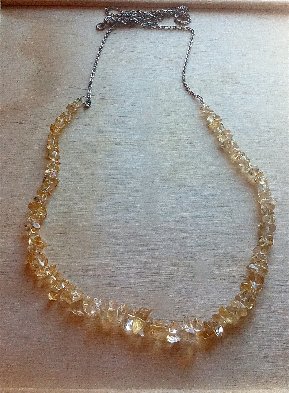 I have a collection of gemstone necklaces because that I use for their healing properties. Citrine is a nice stone to have in one’s crystal medicine cabinet so I restrung a broken tumbled citrine necklace. But it was pretty short — I don’t like things that are tight around my neck. So I added a long length of chain to the end. I like it because it kind of looks like rock candy.