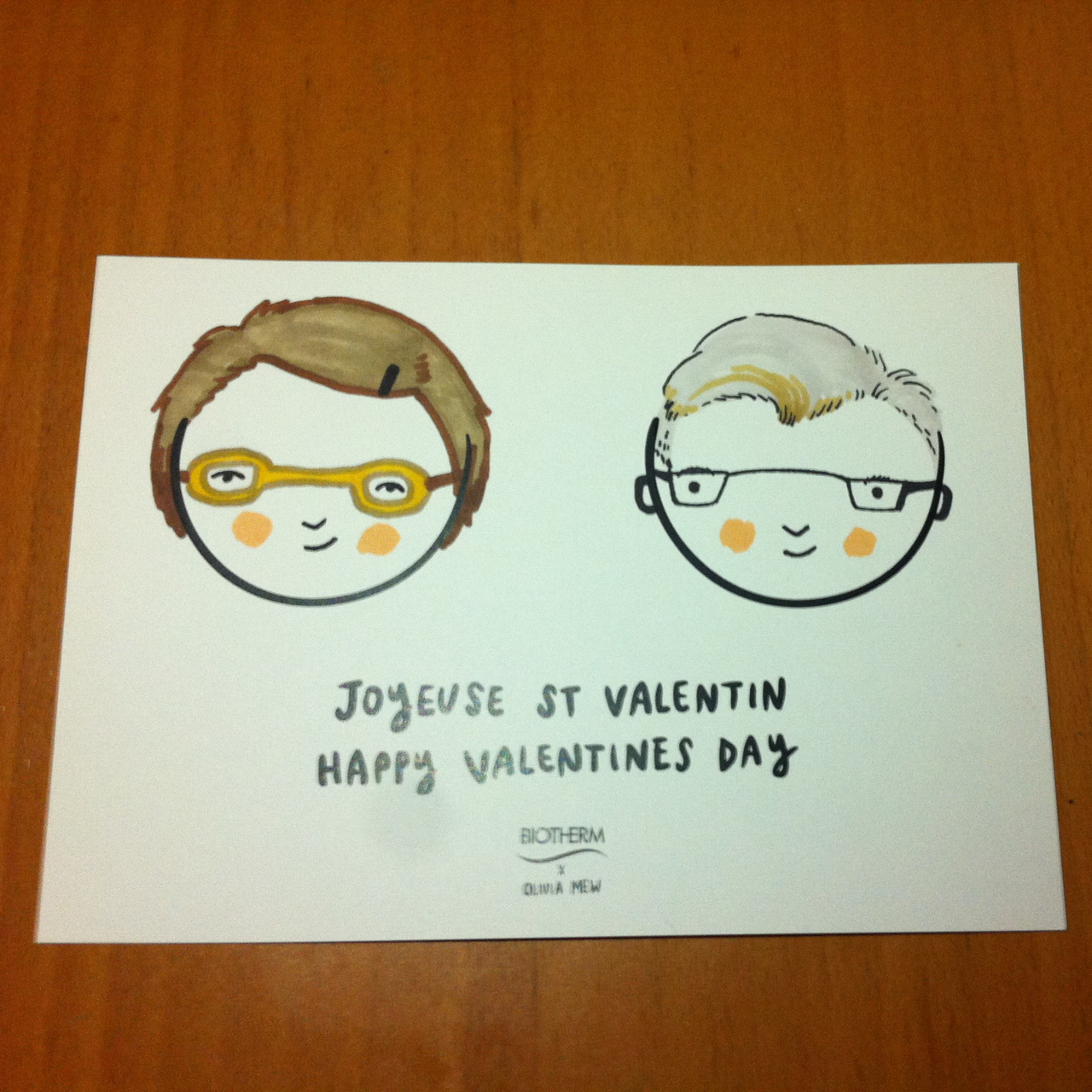 Last year for Valentine’s, Mr. Andrew and myself had ourselves scanned and turned into a 3-D image. A couple of weeks ago, we heard about a collaboration that Biotherm was doing with Stay Home Club‘s Olivia Mew. Basically Mew would be appearing live at the Biotherm counter at the Bay, drawing personalized pictures for Valentine’s Day. Here is the result!