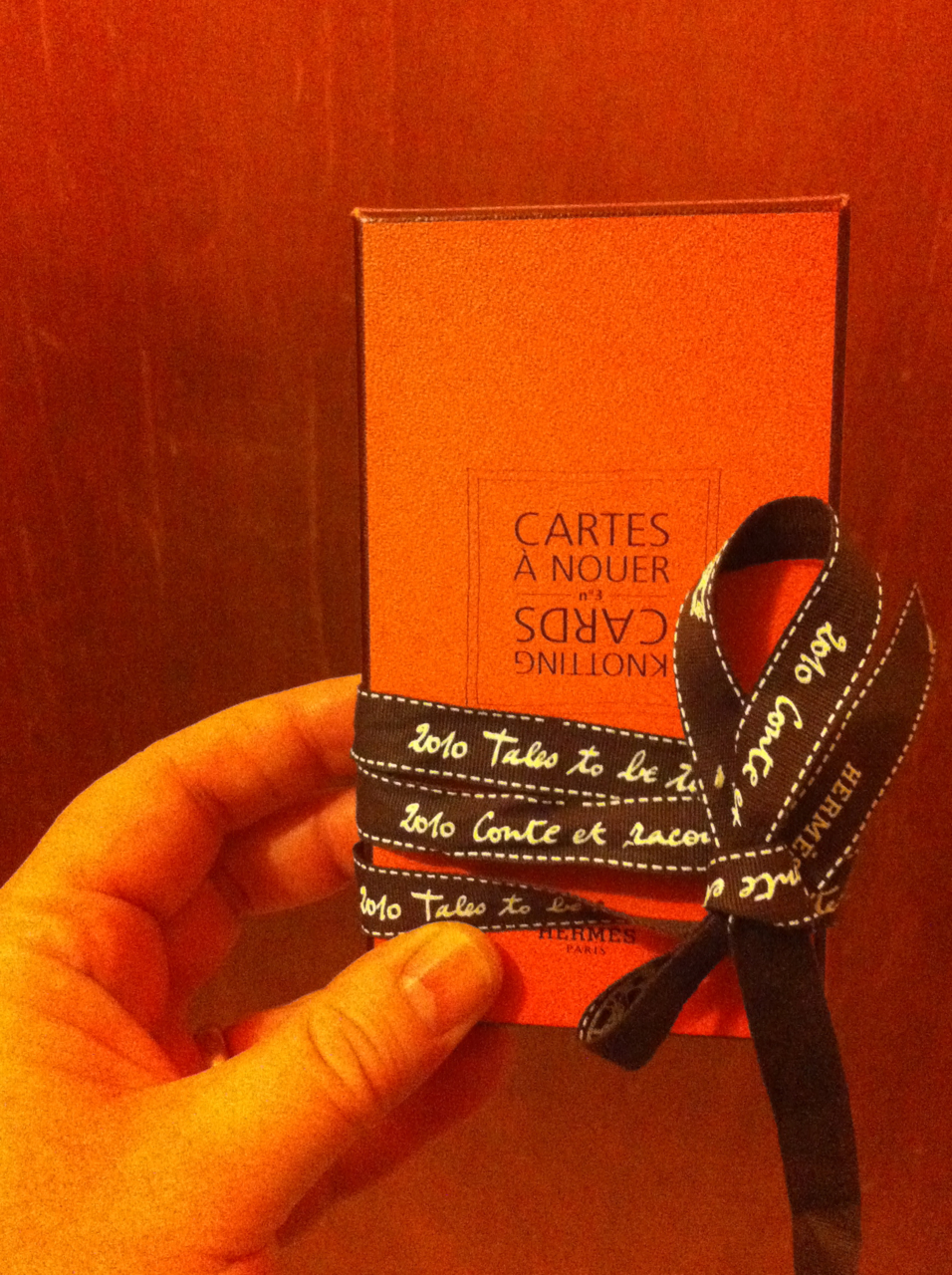 I love Hermès and I love scarves so I love this present from my friend Jessica: A set of instructional cards that illustrate different ways to tie your Hermès scarf (of course you can use it to reimagine your non-Hermès silks as well).