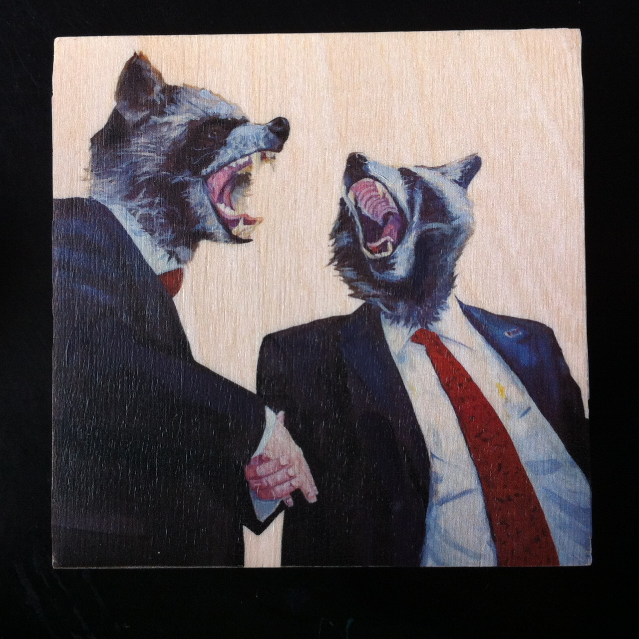 I also got a small oil and transfer on board by Tony Taylor. It depicts Prime Minister Stephen Harper and Toronto Mayor Rob Ford with raccoon heads. So much great art for under $100! If I hadn’t run out of money, I’d’ve bought even more. Maybe I’ll get lucky and find a couple of $20 bills between now and Sunday