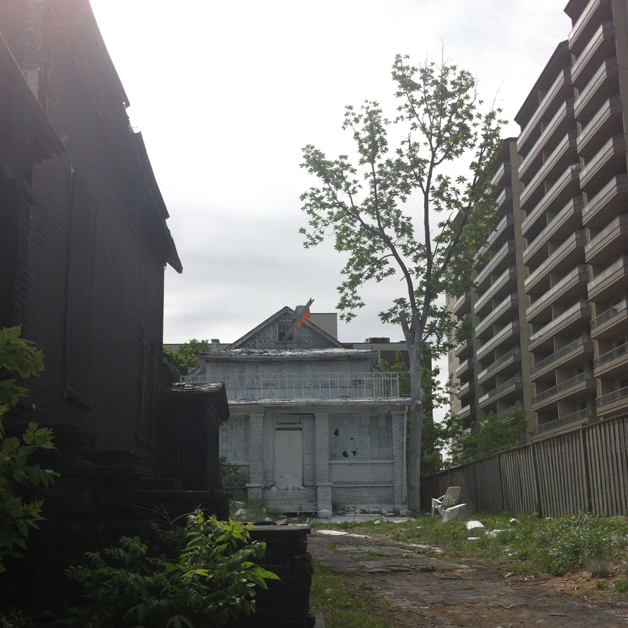 I saw many intriguing street scenes, including a man who had collected a whole bunch of goose feathers and was sticking them into fence posts. There is also an outdoor art thing going on called “It Should Always Be This Way” which is presented by Contemporary Art Forum Kitchener and Area (CAFKA). The piece pictured above is of two abandoned house that have been painted black and white and shot through with oversized arrows. It is by Don Miller and it is called “Saturn and Cronus.”