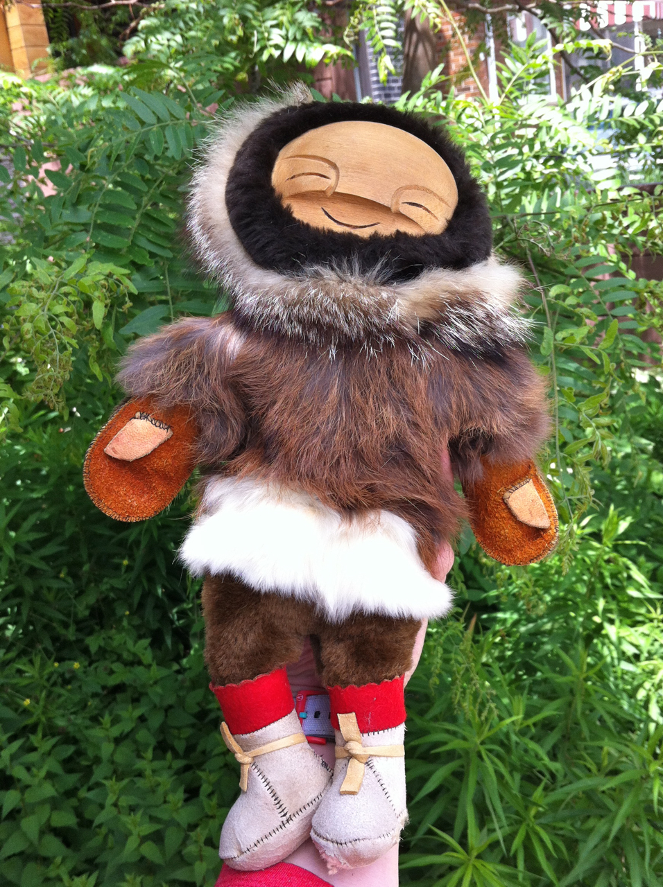 Went to the annual Trinity Bellwoods Park Yard Sale last Saturday. I went in the morning and picked up a few treasures (to be discussed in a separate post) and again in the afternoon whilst out strolling with Mr. Andrew and nephew Nicholas. During my A.M. trip, I visited friends Eric from Lucky Patina and Jonathan. I was admiring a fur clad doll with a beaming wooden face and Eric said I could have it. I could not say no. The style of dress and the carved wooden face suggests strongly that it is from Alaska, possibly by a Yupik carver, probably for tourist. As always, more research needs to be done.