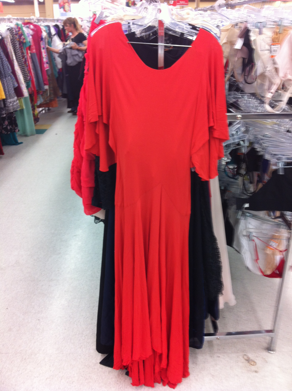 I was at the VV looking for a dress to wear to this summer’s weddings and I fell in love with the gown pictured below. It was so beautiful that I alsmost bought it even though it didn’t fit me (and even if it did, its clingy jersy material wouldn’t have been that flattering to my narrow shoulders and ample bosoms), I still almost bought it “for inspiration.”