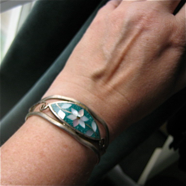 At the counter, they had jewellery surprise sacks. The one I got had this Mexican Alpaca crushed turquoise and mother of pearl inlay cuff in it. I gave it to my fried Lynda because she is pining for Mexico at the moment.