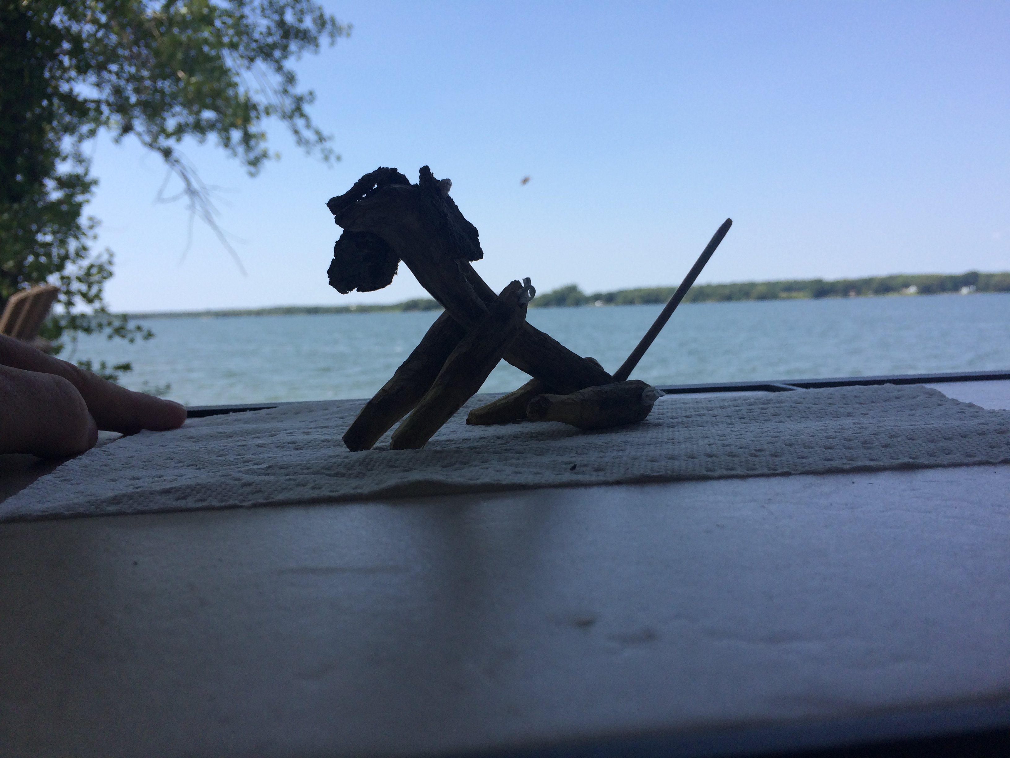 The relaxation was much-needed after a super hectic week. I had many deadlines and meetings last week. In fact, I was so distracted that not only did I forget my phone, I also forgot to bring any art supplies (I wanted to try some plein air painting). So I improvised crafts using materials that I found on the island. There were lots of cottonwood trees, and cottonwood is easy to carve so I borrowed a knife to do some whittling. I made an articulated man (pictured up top) and an effigy of our hosts’ pup, Harvey (above). I attached the arms and legs with twist ties that we found in the utility drawer of the cottage. Mr. Andrew calls the dog “Carvey.”