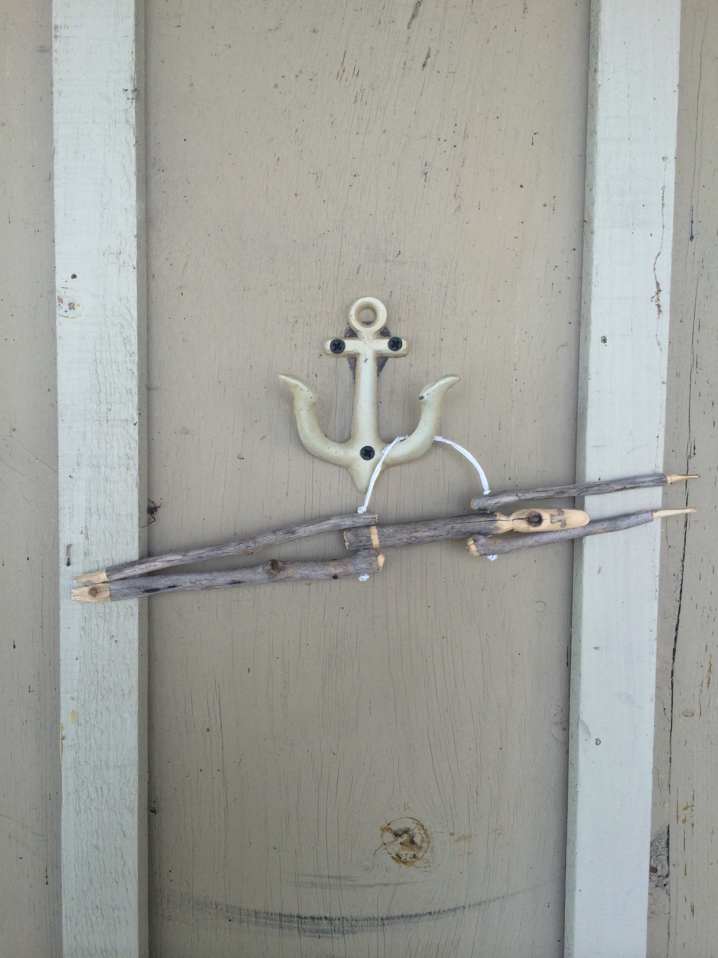 There was also lots of open water swimming, so I picked up some mussel shells from the lake bed, cleaned ’em and strung ’em up with some old nylon twine that we found in the cottage, and hung ’em from some sticks. It is the quietest of wind chimes because I didn’t measure the string correctly (I was improvising). But our hosts liked that even better.