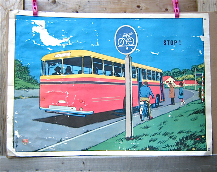 Found this beat up Belgian traffic safety poster on the sidewalk last week. It’s actually part of a portfolio of 24 prints, commissioned by the Belgian Via Secura agency and illustrated by artist René Miessen (1911 – 2000). Miessen was an interesting character — at the age of 45 after a very successful career in advertising, he moved to Paris to pursue a career as a symbolist painter under the name Bellor.