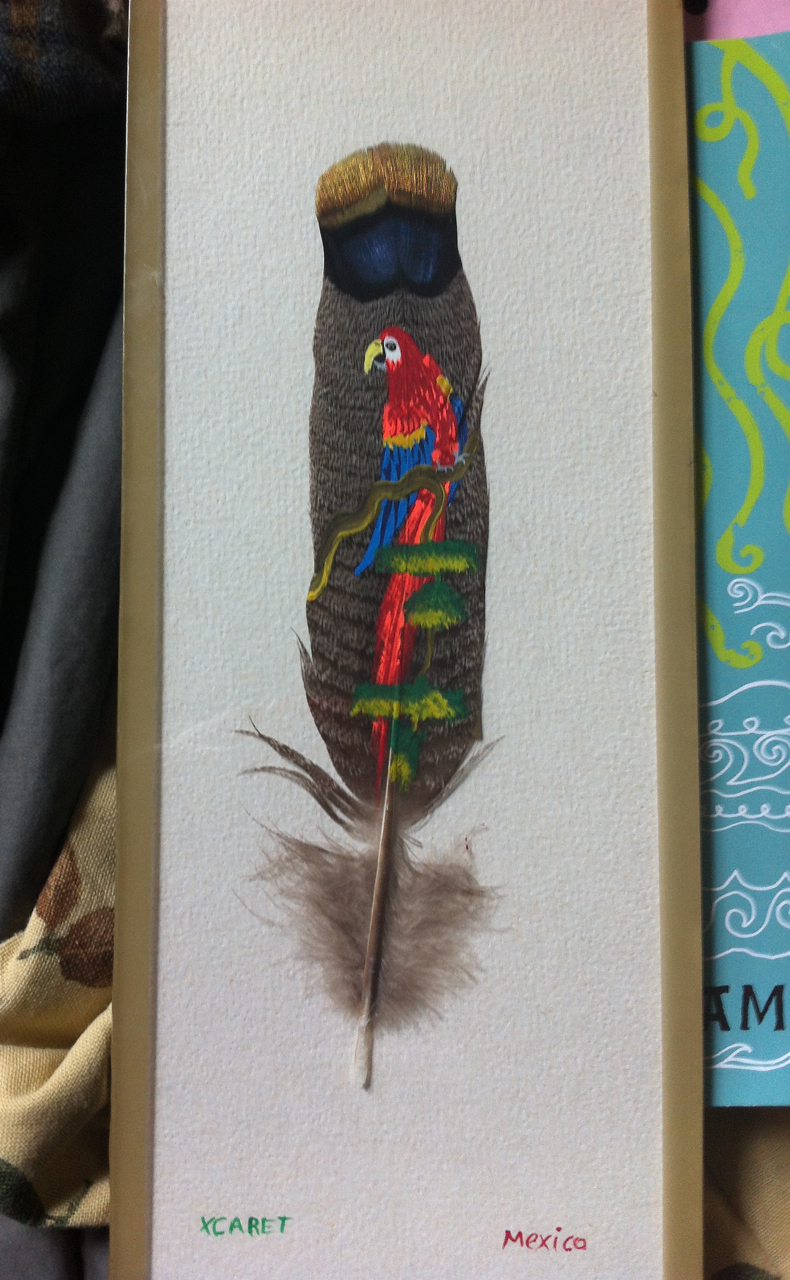 My niece Sarah found this painted feather from Mexico. The people that she bought her house from left it behind. She knows that I’m a sucker for all Mexican Arts and crafts so she gave it to me. It almost looks like embroidery! I also appreciate the fact that it’s a parrot painted on a different kind of bird’s feather.