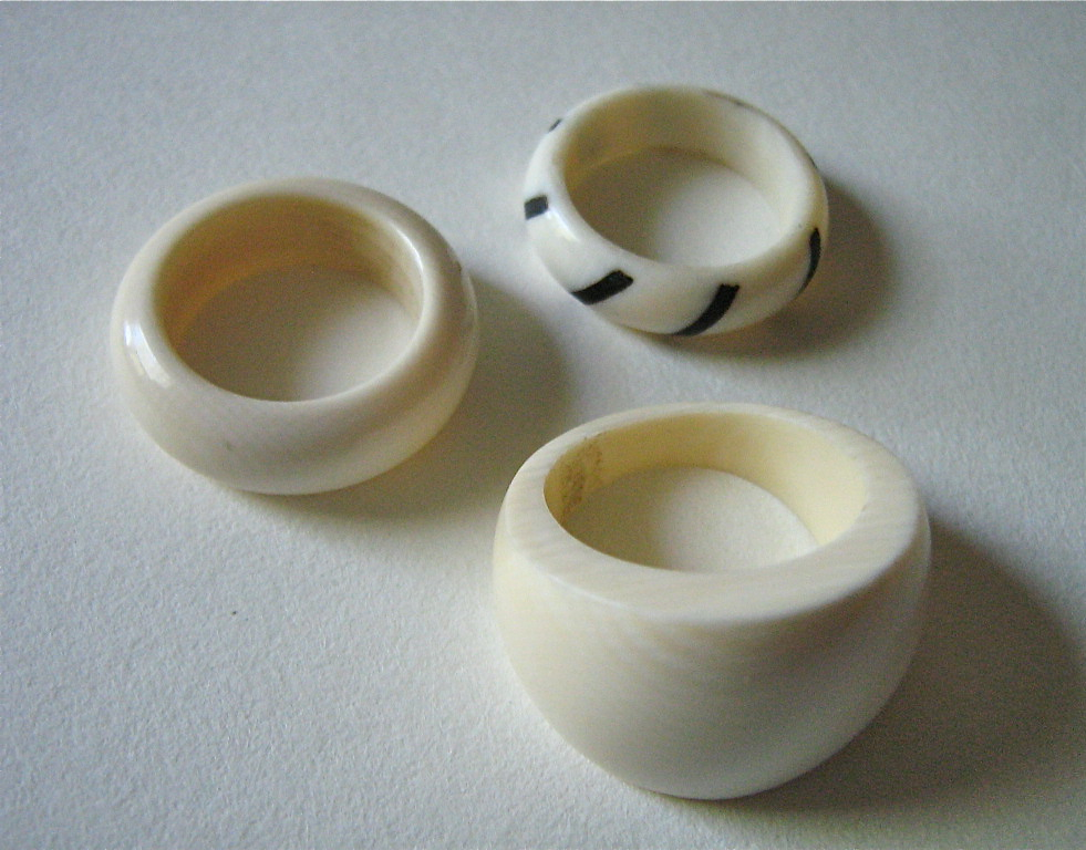 I keep acquiring ivory even though I’m not trying to. In fact I just sold a bunch to a dealer at the St. Lawrence Market because I couldn’t deal with it anymore. These rings were all part of the gigantic auction lot I got at Waddington’s last month. Two of the three rings pictured above are Elephant Ivory. The one with the black lines is something organic, but not elephant. I don’t deny that it looks and feels beautiful but wearing it makes everybody feel awkward and selling it is tricky. Which is probably how it ended up in a big lot of costume jewellery — people keep passing the problem along.