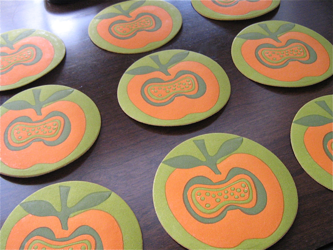 Since I don’t drive, when I visit my parents in Kitchener my thrifting range is limited to second-hand shops within walking distance of my parents’ downtown apartment. Happily for me, the Bibles for Missions Thrift Store has relocated to Scott Street in the old Braun Bikes space. It’s a bright and clean space and while I’ve never found any big scores there, I always find something neat and cheap in the housewares section. Like this set of paper coasters. They are so distinctively seventies with their mod sliced apple design, avocado and orange colour scheme and flocked and embossed texture. Priced at only 25 cents I could not resist! Now the next question is what to do with them? I thought about découpaging them onto cork and making them reusable coasters, but I’m afraid of damaging the flocked finish.