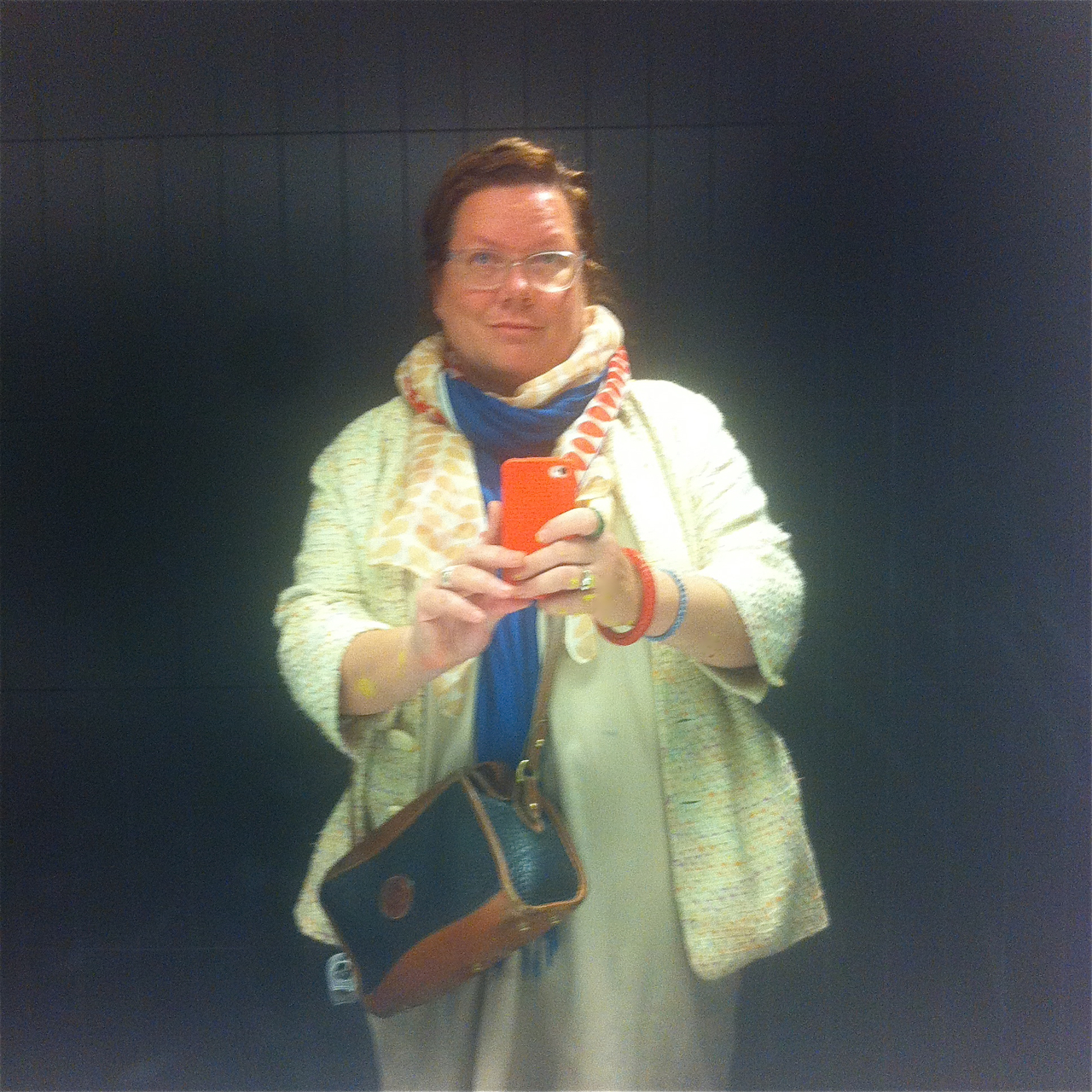 I haven’t taken a picture of myself modelling my clothes in a bathroom mirror in a while, but I was rocking what I think was a particularly successful look. What makes me happiest is that it puts together many of my wardrobe staples in a new way. The Orla Kieley scarf is new, but I’ve paired it with a pashmina that was a gift from Eric of Lucky Patina. The bouclé Bob Mackie jacket and the Dooney & Bourke bags are wardrobe war horses. And the Moroccan kaftan is a San Francisco find that I had shortened so I could wear it as a tunic. The jade saddle ring and faux cinnabar bangle have been favourites since I found them this summer.
