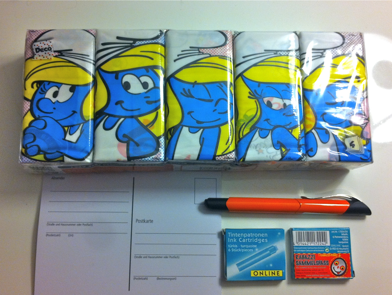 Here are my notes on Dresden style: Fashion-wise, folks tend to favour a “women in the arts” vibe. But design-wise, there were fantastic examples of the Bauhaus/Deiter Rams philosophy of form over function. I discovered a cool discount store called Pfennigpfieffer. It had an amazing stationery section, where I picked up this German-made Online fountain pen for 9 Euros (and plenty of refills at 1 Euro for a package of 6), some make your own postcards for 50 Euro cents (which I sadly forgot in my hotel room) and a bunch of Smurfette tissues for 1 Euro (for my friend Alison).