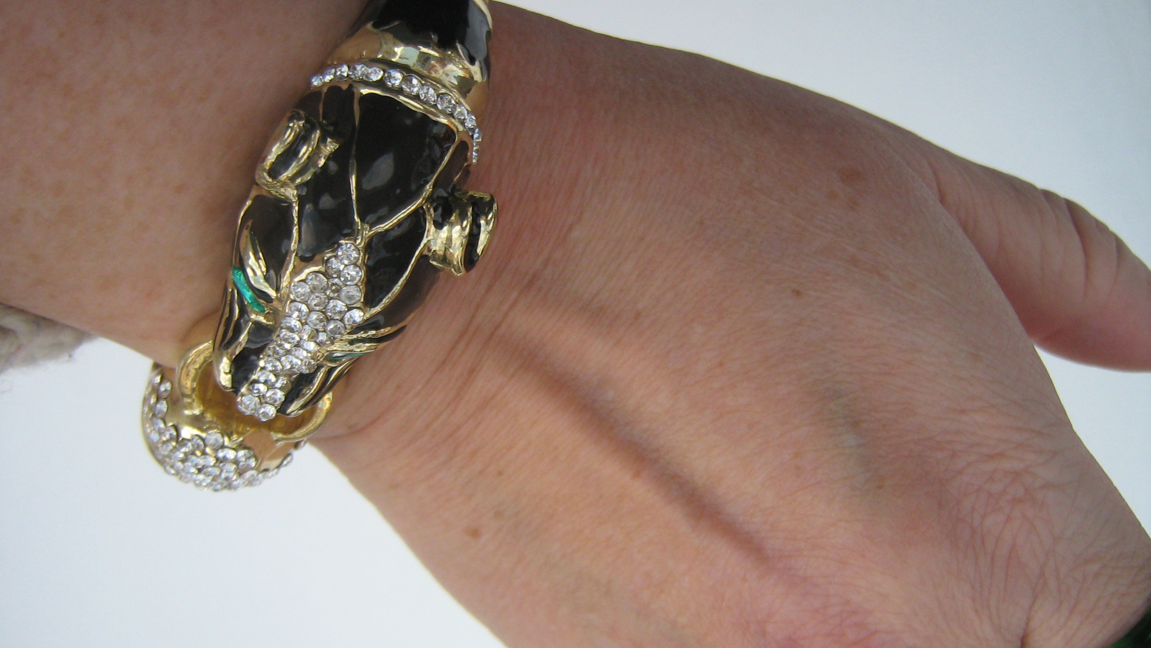 Found this enamelled and bedazzled panther bracelet for $5 at Flashback in Kensington Market last week. It is an homage (meaning a copy that is just slightly off) of a 1990s-era piece by Ciner. Unsigned, it’s still a heavy-duty piece of arm candy. It’s so de trop that I think I could wear it with a garbage bag for New Year’s Eve and still look like a glamorous and sophisticated lady.