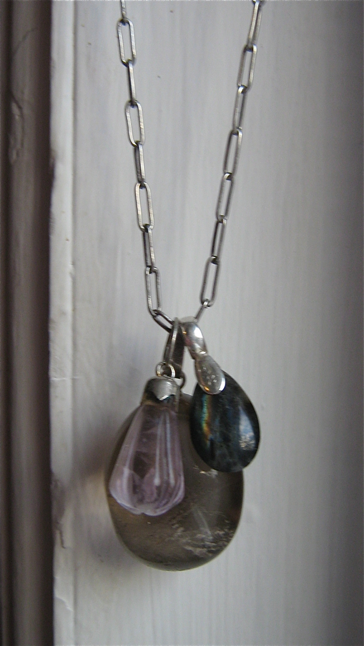 I found this big, tumbled smokey quartz pendant on a recent Value Village expedition. I added it to two other polished gemstones that I’ve had for ages — an amethyst that is carved in a sort of half teardrop/half melon shape and a teardrop-shaped labradorite. I had these two hanging together on a long silver chain, but they always felt a little off-balance. Things just work better in odd-numbered parings sometimes and the smokey stone somehow completes the look, I think.