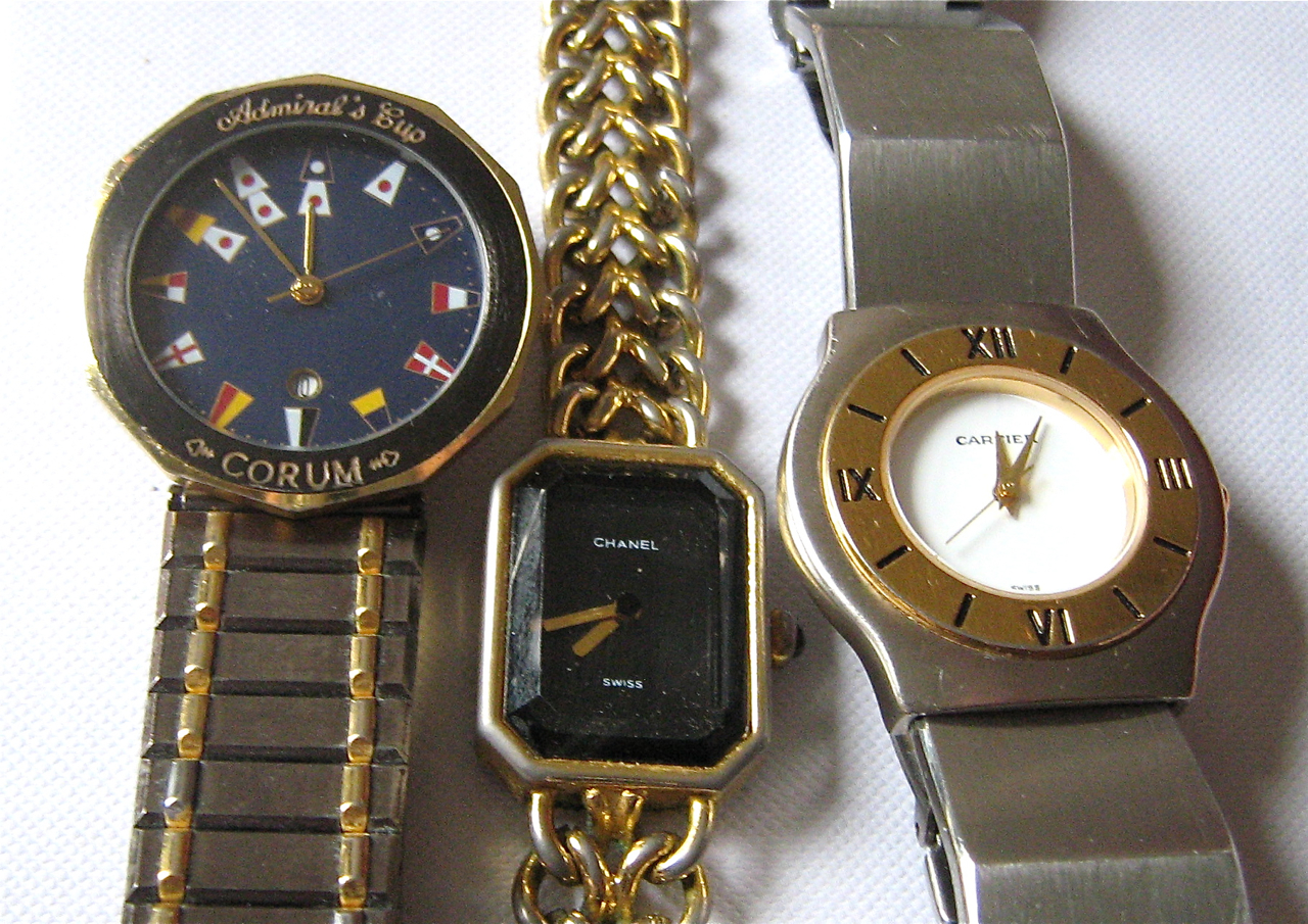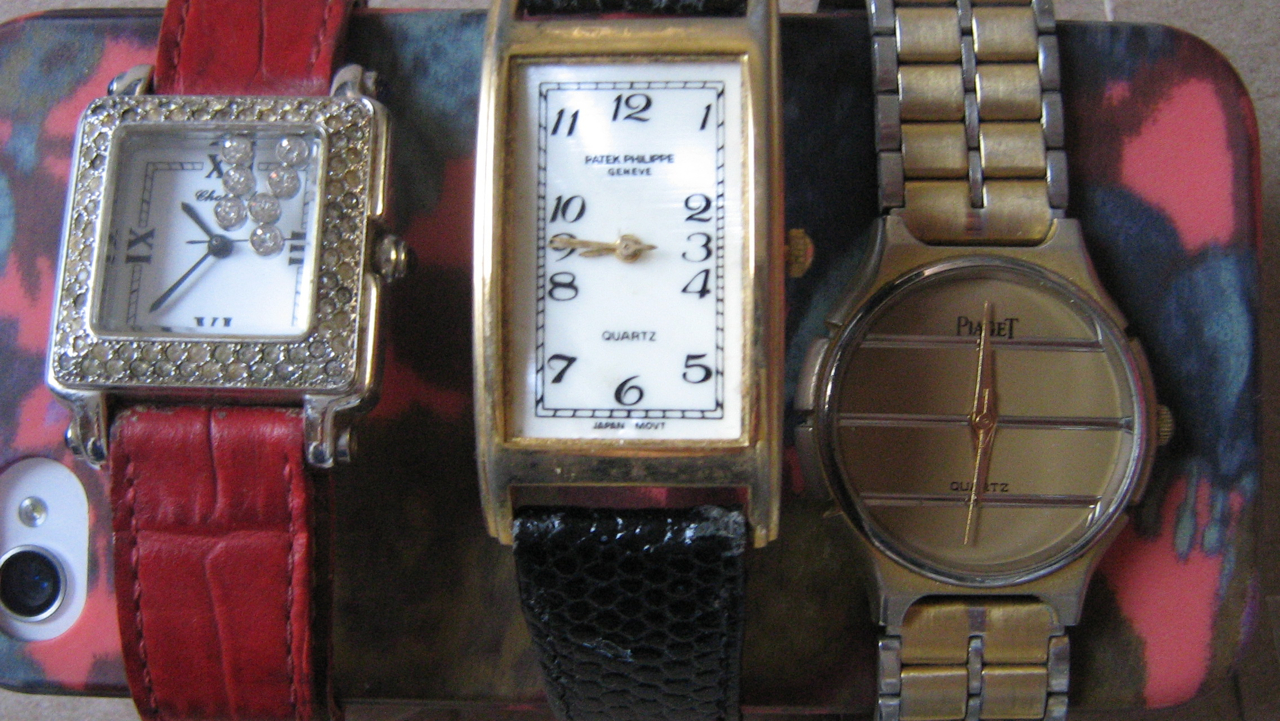 Which brings us back to why I have a collection of fake watches: I could never knowingly sell a knock-off. I can’t even in good conscience donate them to a thrift shop. And most of them aren’t even good enough fakes to use as props. I mean look at the Patek Phillipe — one of the most prestigious of Swiss watchmakers and it says Japan Mov’t on the dial. And Cartier never made a watch that looked like that.