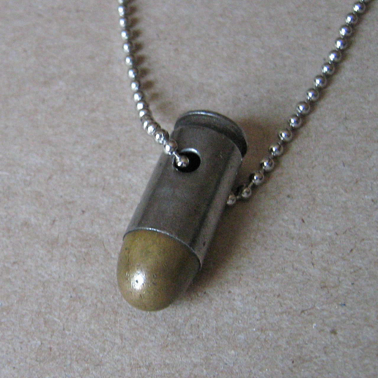 This is a twice upcycled project. Originally, someone took a used bullet casing, drilled a whole through it, and turned it into a key chain. I found that key chain in a jewellery lot years ago. I found it while cleaning up and hung it from a length of ball chain. Now I have a cool new bullet necklace.