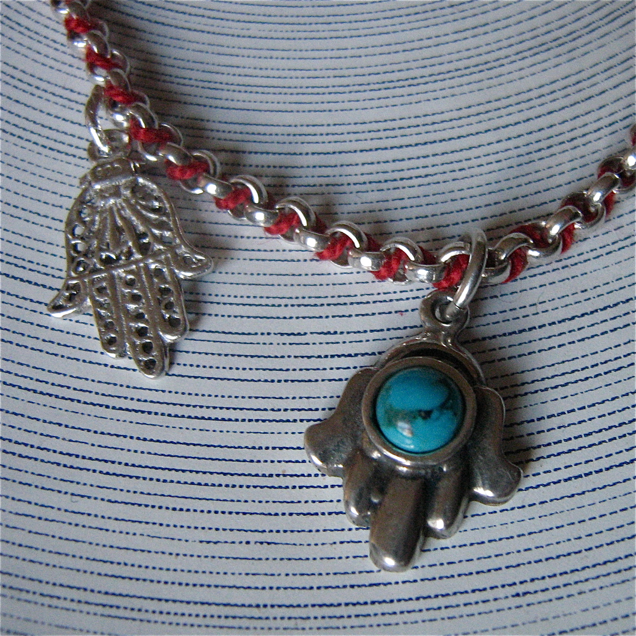 A couple of weeks ago, I was talking about my many hands. Here’s another main main from my jewellery box — a silver bracelet with two Hamsa charms. This palm-shaped talisman is used to protect the wearer from the evil eye. The bracelet itself is also threaded with a red Kabbalah string to further ward off danger.