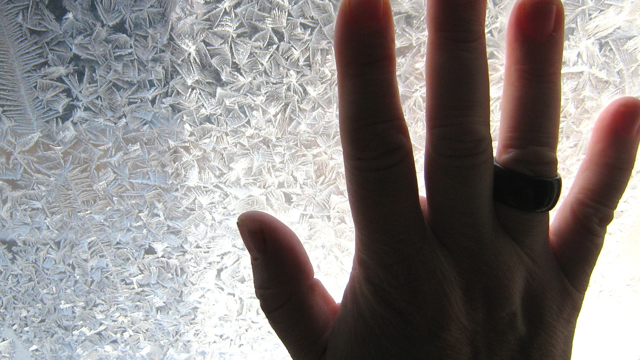 So here’s a brief moment of beauty that I found today. A simple wooden band (too cold to wear metal) contrasted against the hoar frost on my window.